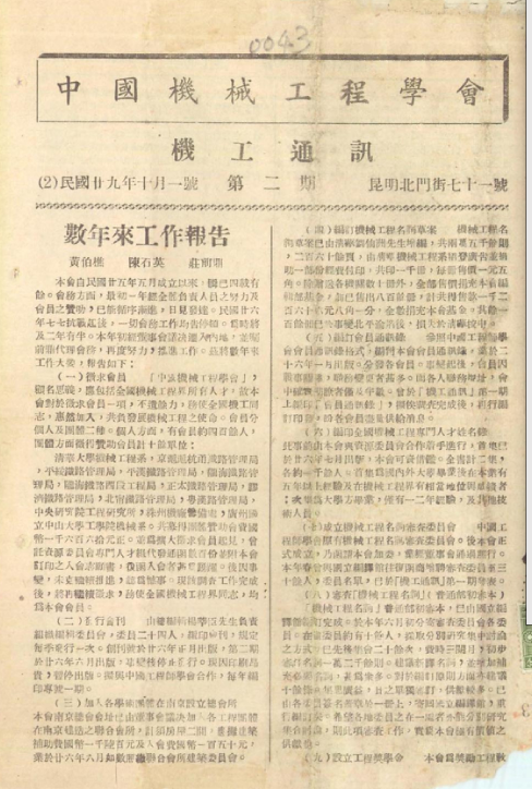 学会会刊《机械工程》(季刊)于1937年出版两期后,因印刷成本激增与战乱停刊,拟与中国工程师学会合作编印年度专号。为维系会员联络,1940年7 月创刊《机工通讯》,每两月一期,刊发会务通告、会员动态及工作报告,成为战时重要的沟通载体。
